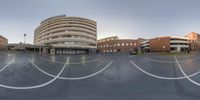 a circular photo of a building in a large parking lot with a stop sign in the center