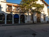 A picturesque tree-lined street in the heart of a historic American city. Two grand buildings, with balconies, stand on either side of the road, offering a perfect setting for restaurants and shops. The clear sky casts hard shadows, adding to the charm of the architecture.