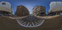 A view of a street in Holland, Netherlands, captured through a unique 360-degree lens on a skateboard. The modern and classic architecture, vibrant urban design, and bustling city life create a dynamic atmosphere.