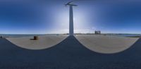 a fish eye lens reflecting the view of a wind turbine at the edge of the road