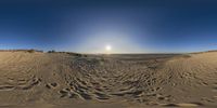 sun shining over the sand dunes and a clear blue sky above them is in front of an ocean