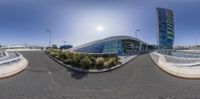 three panorama images of an airport with a large building in the background, taken in a fisheye lens