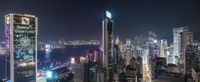 An aerial view of Hong Kong's cityscape at night. The high-rise skyscrapers illuminate the city with neon lights, creating a modern and vibrant urban atmosphere. The city's business district is in full operation, showcasing its status as a bustling metropolis in Asia.