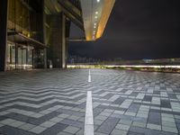 This is an image of a wide open square in the bustling city of Hong Kong. The black paved area and modern architecture of the office buildings create a striking contrast against the night sky. The city lights illuminate the urban landscape, highlighting the skyscrapers and creating a vibrant cityscape. The low clouds add an atmospheric touch to the scene. This photo captures the essence of city life in Hong Kong, showcasing the urban design and business district in all its glory.