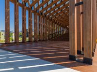 an outdoor area with a bunch of wooden beams that are attached to the ceiling and floor