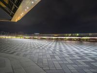 The vibrant city of Hong Kong comes alive at night with its dazzling city lights. Walkway illuminated by bright lights, leading to modern office buildings. The urban landscape showcases the city's iconic skyscrapers and modern architecture.
