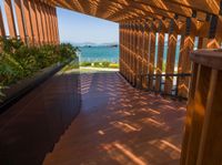 An elevated wooden patio overlooking the Hong Kong coastline. The coastal architecture features large windows and shutters casting hard shadows. Enjoy the open space and top-down view of the ocean.