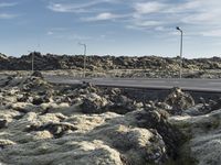 A rugged landscape in Iceland, showcasing the unique natural environment. The clear sky and contrasting clouds create a picturesque backdrop for the coastal and highland formations. A road winds through the mountains and lava fields, surrounded by vegetation and grass surfaces.