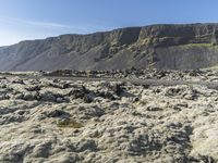 This is an image of a rugged landscape in Iceland, Europe. The photo captures a mountain with a grassy slope leading up to it. The clear sky above highlights the cloud formations and the natural environment surrounding the mountain. The terrain is characterized by bedrock outcrops and highland features, showcasing the erosion processes that have shaped the landscape. This photo represents the beauty and geological diversity of Iceland's mountainous regions.