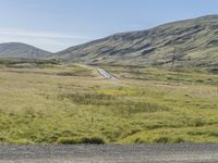 A rural road in Iceland winds through a mountainous landscape. Clear skies and lush vegetation create a picturesque scene. The gravel-covered terrain offers a challenging adventure for nature enthusiasts.
