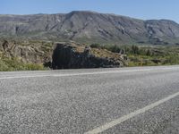 A road cutting through the Icelandic highlands, surrounded by breathtaking mountain landscapes and vast grassy plains. Clear skies above reveal the natural beauty of this European island.