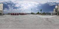 Industrial Manufacturing Area: Red Trucks on a Dirt Surface