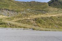 a motorcycle parked on a small mountain side road near mountains with no cars driving on it