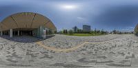 a view of an empty walkway and street from a fisheye lens lensed by two buildings