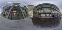 an abstract image showing the exterior of a modern building with many arches and a circular entrance