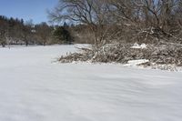 A beautiful winter landscape photo taken in Ontario, Canada. The image shows a patch of brush on the grass-covered ground with snow all around. In the background, there is an open space with trees, branches, and a frozen lake. The sky is clear, and the air is freezing. The photo captures the tranquility and natural beauty of the Canadian winter.