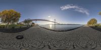 a wide angle view of a bridge in the distance and a path by a body of water