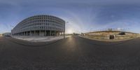 a wide angle lens photo of a curve road near a building, a large clock tower and buildings in the distance