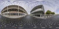 a couple of distorted pictures are on a floor outdoors, with sky reflected in them