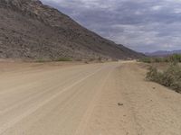 A stunning landscape photograph of a lonely road in the African desert. The road stretches endlessly into the distance, surrounded by sandy terrain, mountains, and brown vegetation. A bird sits gracefully on the roadside, while small patches of grass and gravel can be seen alongside the asphalt road. The clear blue sky is adorned with fluffy clouds, creating a peaceful and serene atmosphere. This captivating image showcases the beauty of nature and the vastness of the African desert.