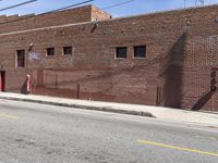 A classic brick-lined road in Los Angeles, California. The clear sky showcases the vibrant red brickwork of the suburban houses. The urban design of the neighborhood blends seamlessly with the surrounding office buildings and business district.