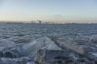 rocky shoreline near a body of water and lots of ships in the distance at dusk