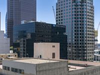 A clear day in downtown Los Angeles, California. The cityscape is dominated by modern high-rise buildings, showcasing the urban design and architecture. The skyline includes towering skyscrapers and office buildings, with a parking deck in the foreground.