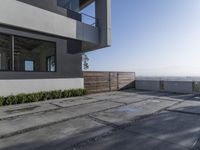 A modern villa overlooking the city of Los Angeles at dawn. The sleek and spacious interior features floor-to-ceiling windows, offering a stunning view of the cityscape. The clear sky and wet surfaces add a touch of luxury to this Californian residential property.