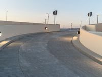 Dawn breaks over Los Angeles, illuminating a concrete walkway lined with parking decks and driveways. The artificial lights add a touch of ambiance to the road. A typical scene in the city.