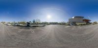 Aerial view of a parking lot in front of a large building in Los Angeles. The modern architecture and concrete infrastructure create a striking profile against the clear sky. The open space and straight road design make it a popular tourist attraction in the city.