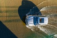 a boat is driving through the shallow water, and its wake is making it's way through