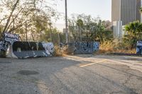 a group of graffiti covered barricades at an abandoned park, including one with a graffiti - spray on it