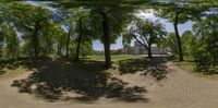a 360 - panorama is shown through some trees and leaves on a path near a house