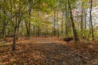 a dirt road in the woods filled with leaves and trees, along with lots of other trees