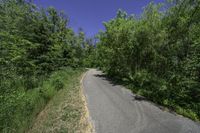 This image captures the beautiful landscape of rural Ontario, Canada. The road surface, made of asphalt, winds through a lush and green scenery. Tall evergreen trees and bushes line either side of the road, creating a natural canopy. The clear sky above adds a touch of tranquility to the scene. This photo represents a peaceful day in the outskirts of Toronto, where nature thrives alongside the road.