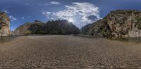a fish eye view of the mountains and water near some rocks on a beach with some grass