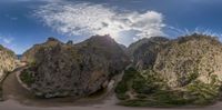 Aerial view of Majorca's coastal landscape in Spain. Rocky walls line the open space, creating a canyon against the clear sky. Gravel and dirt surfaces contrast with the ocean water along the European coastline.