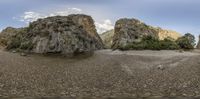 A scenic view of a coastal landscape in Majorca, Spain. Rocky walls, clear skies, and ocean waters create a peaceful scene. Open spaces contrast with canyon shadows and gravel areas.