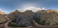 A scenic landscape in Majorca, Spain, featuring a rock wall and open space. The Balearic Islands' canyon under a clear sky with shadows. An aerial view of coastal ocean serenity.