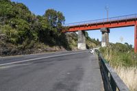 This image showcases the Makatote Viaduct, a bridge over a road in New Zealand. Surrounded by green trees, grass, and bushes, the viaduct stands near the majestic mountain range. The asphalt road and the straight path leading to the bridge reflect the country's well-developed infrastructure. The clear sky enhances the natural beauty of the landscape. This photo captures the tranquility and serenity of New Zealand's nature. It represents a typical day of peacefulness and transport along the well-maintained highways of the country.