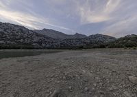 A breathtaking view from Mallorca, Balearic Islands, at the break of day. The clear sky illuminates the mountain range and reflects on the calm water of the lake. The rocky landscape and sparse vegetation add to the wilderness charm.