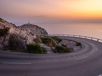curved road with steep incline in foreground overlooking the ocean at dusk with lighthouse in distance