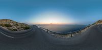 a fish eye lens view of the road leading to the ocean at sunset on a clear day