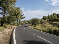 This image captures a scenic road in Mallorca, Balearic Islands, Spain. The road is made of asphalt, flanked by trees on both sides. The clear blue sky above adds to the beauty of the landscape. The photograph showcases the natural and rural beauty of Mallorca. It represents a bright sunny day in Europe, offering a peaceful and relaxing view of the road and the surrounding nature in the Balearic Islands.