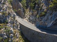 An aerial view of a high and curvy road in Mallorca, Spain. The road winds through a stunning landscape with steep cliffs and canyons. The top-down perspective showcases the elevated beauty of the Balearic Islands.