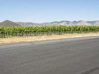 This stock photo features a man wearing a red shirt riding a skateboard on an asphalt road in the countryside area of California's scenic mountains. The landscape is filled with lush vegetation, including trees, fields, and vineyards. The clear blue sky and natural environment create a serene setting for outdoor activities. The image captures the beauty of California's rural areas, showcasing the rural infrastructure and the agricultural land lots and plantations that make up the region.
