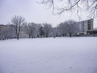A man is seen walking through a large open field with lots of trees on a snowy day. The serene atmosphere and natural landscape make for a beautiful winter scene. Sunlight peeks through the trees, casting a warm glow on the snow-covered ground. The man's presence adds a sense of scale to the image, emphasizing the vastness of the surrounding nature. Branches and twigs can be seen scattered across the snowy terrain, adding to the overall picturesque winter setting.
