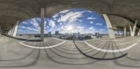 Aerial view of Miami Beach, Florida. The city's skyline with towering skyscrapers dominates the concrete landscape. Open parking lots and elevated walkways provide a high position to appreciate the sunny cityscape. Straight down the road, the sun casts hard shadows on the surface.