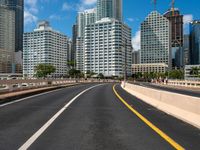 This is an image of the empty road in the business district of Miami, Florida, USA. The modern architecture of the office buildings and skyscrapers creates a stunning cityscape. The clear sky with clouds adds to the urban design. Cars can be seen driving on the asphalt roadway, showcasing the bustling city life of Miami. This photo captures the dynamic and vibrant atmosphere of the city, perfect for representing urban business and modern architecture in Miami.
