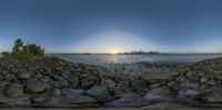 A stunning view of Miami Beach's cityscape at dawn, with the sun rising over the ocean. The skyscrapers reflect the vibrant colors of the sunrise, creating a beautiful urban design. The open space and coastal location add to the charm of this sunny city.